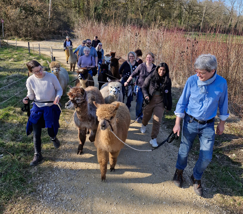 Eine wunderbare Möglichkeit ist es, das eigene Führungsverhalten auf der Weide und mit Hilfe der zugewandten, aber immer ehrlichen Alpakas zu reflektieren. Beim Spaziergang dann im doppelten Sinne beim Führen mit der Leine.